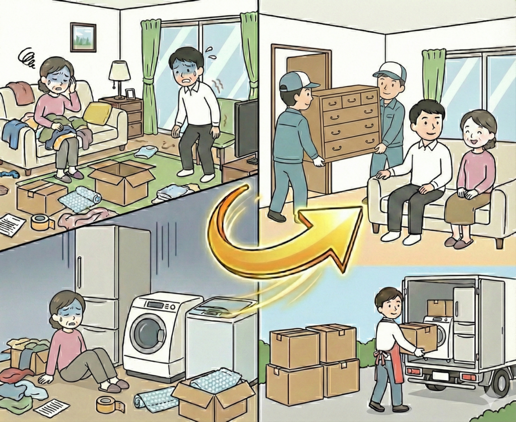 引越しの荷造りや不用品の処分は、想像以上に時間と労力がかかります。特に大型家具や家電の処分は、自分では難しいことも。引越し手伝いや不用品回収サービスを利用することで、スムーズに引越しを進められます。「引越しまでに間に合わない」という方も、まずはご相談ください。