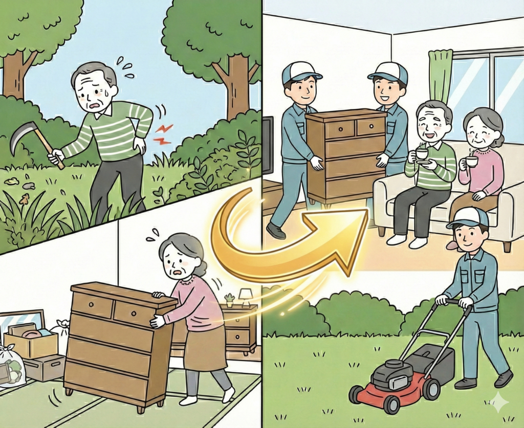 高齢の方にとって、草刈りや家具移動などの作業は危険を伴います。無理に作業を試みると転倒やケガにつながる恐れも。業者に頼むことで、安全かつ丁寧に対処してもらえるため、安心して任せることができます。「子供に迷惑をかけたくない」という方も、まずはご相談ください。